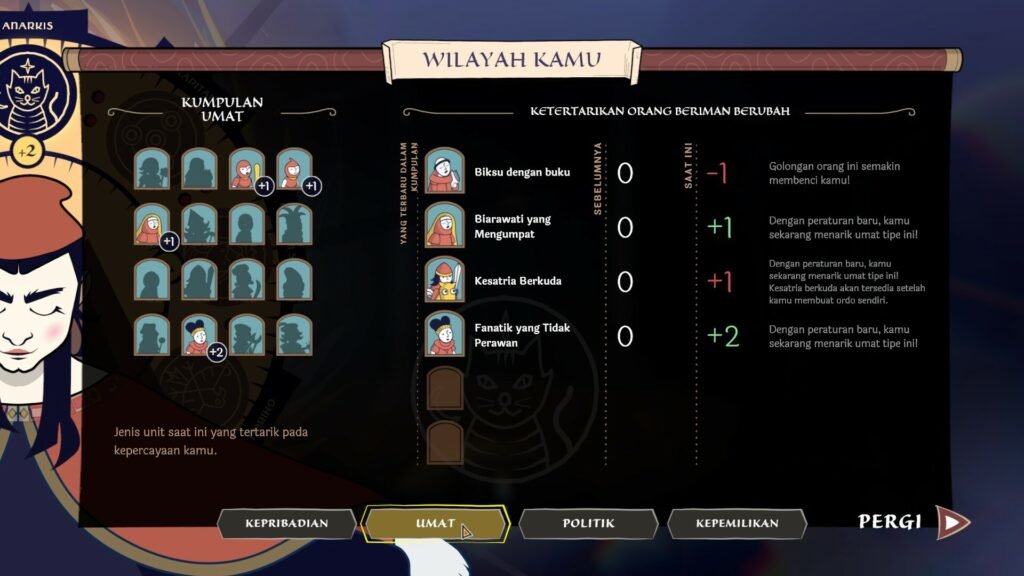 Pilihan-pilihan ini tidak hanya memengaruhi akhir cerita, tetapi juga membentuk perjalanan pemain dari awal hingga akhir. Apakah Anda akan menjadi figur suci yang tulus, seorang nabi radikal, atau manipulator ulung yang memanfaatkan iman demi kekuasaan? Game ini memberi kebebasan penuh, sekaligus menantang pemain untuk menerima konsekuensi moralnya.