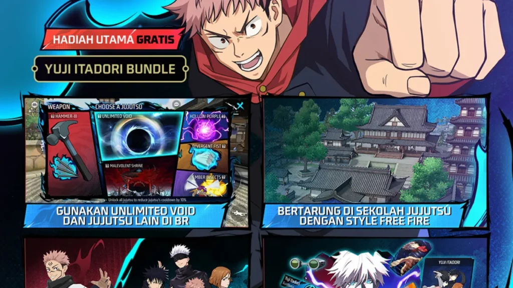 Event Free Fire x Jujutsu Kaisen: Bangkitkan Jujutsu-mu merupakan salah satu kolaborasi anime terbaik dalam sejarah Free Fire. Dengan menghadirkan karakter ikonik, mode permainan spesial, skill bertema kutukan, serta deretan item eksklusif, event ini berhasil menciptakan pengalaman bermain yang segar, intens, dan penuh gaya.