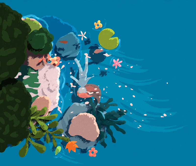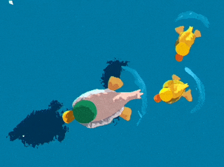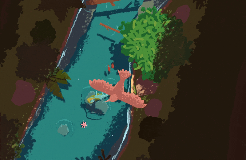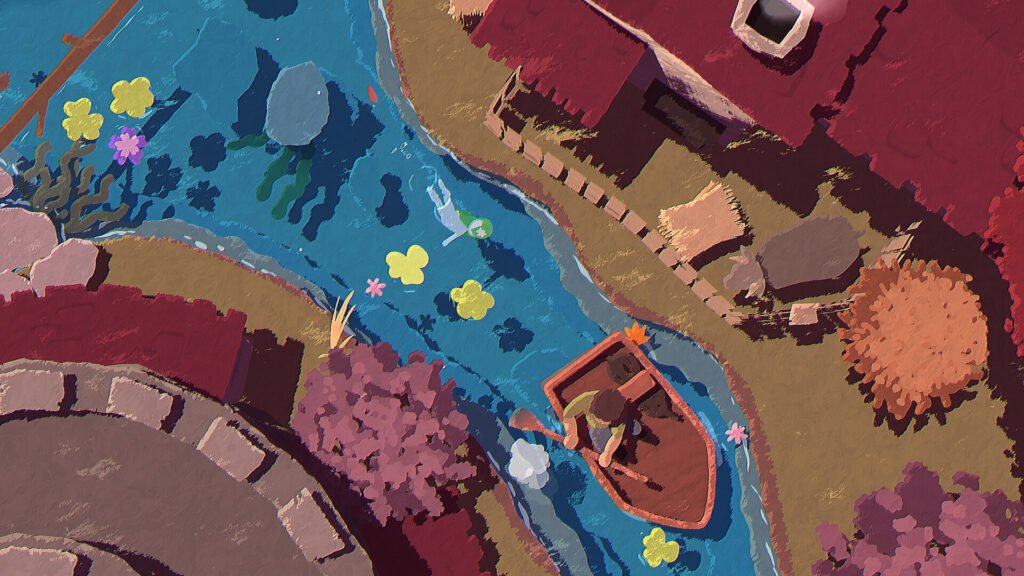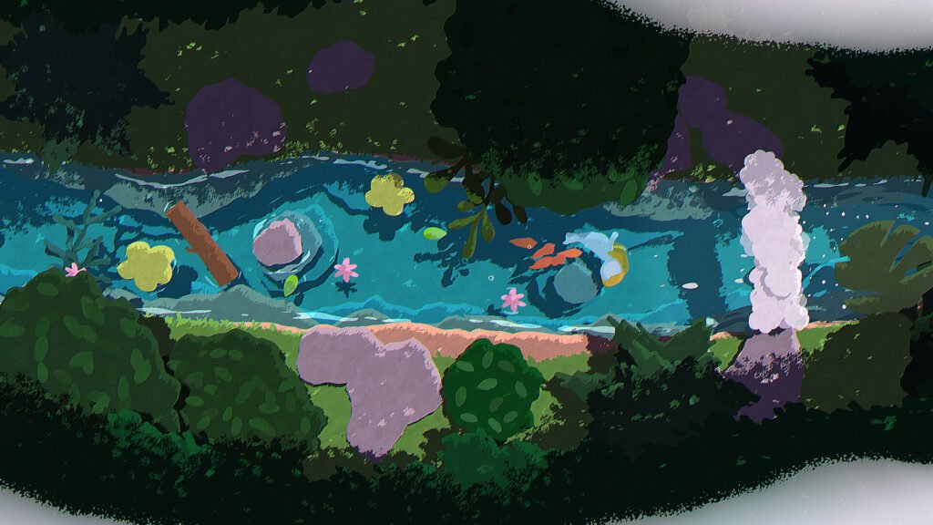 Alih-alih meniru realisme, gim ini mengadopsi pendekatan stilisasi yang menghangatkan. Air digambarkan dengan warna turkis yang memudar perlahan di tepiannya. Rumput dan tanaman air menyatu secara abstrak, membentuk lapisan visual yang lembut. Cahaya matahari menembus permukaan air seolah-olah mengajak pemain untuk berhenti sejenak dan menikmati detail kecil yang biasanya luput dalam gim lain.