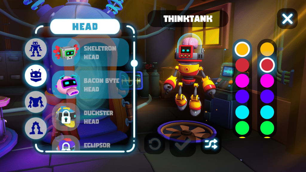 Lingkungan laboratorium dan fasilitas futuristik dibuat dengan nuansa cyber-industrial, dengan lampu neon, panel kontrol elektronik, dan mekanisme mekanik yang bergerak. Atmosfer ini memperkuat tema permainan, membuat pemain merasa berada di dunia robot mini yang canggih namun penuh tantangan.