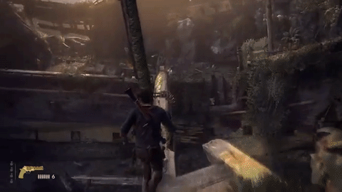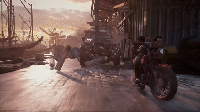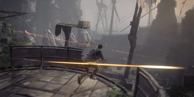 Salah satu ciri khas Uncharted adalah set-piece—adegan scripted yang sangat megah seperti: